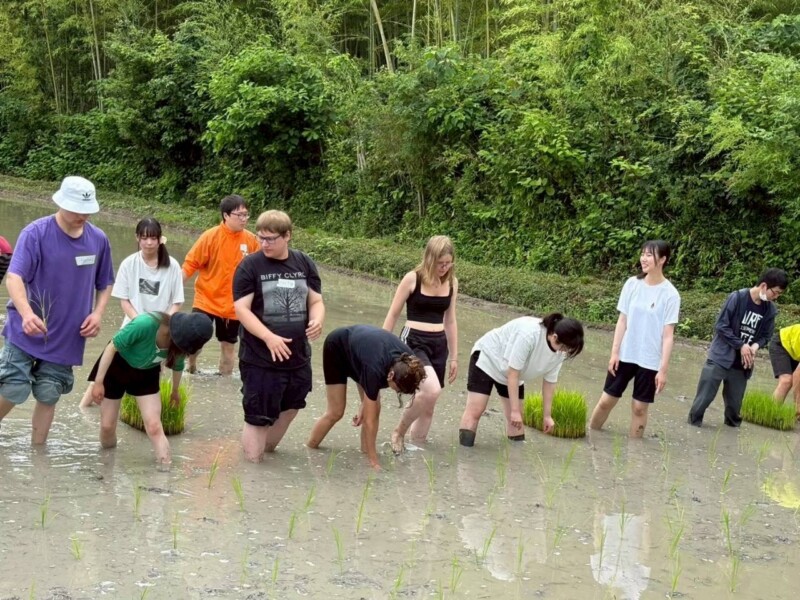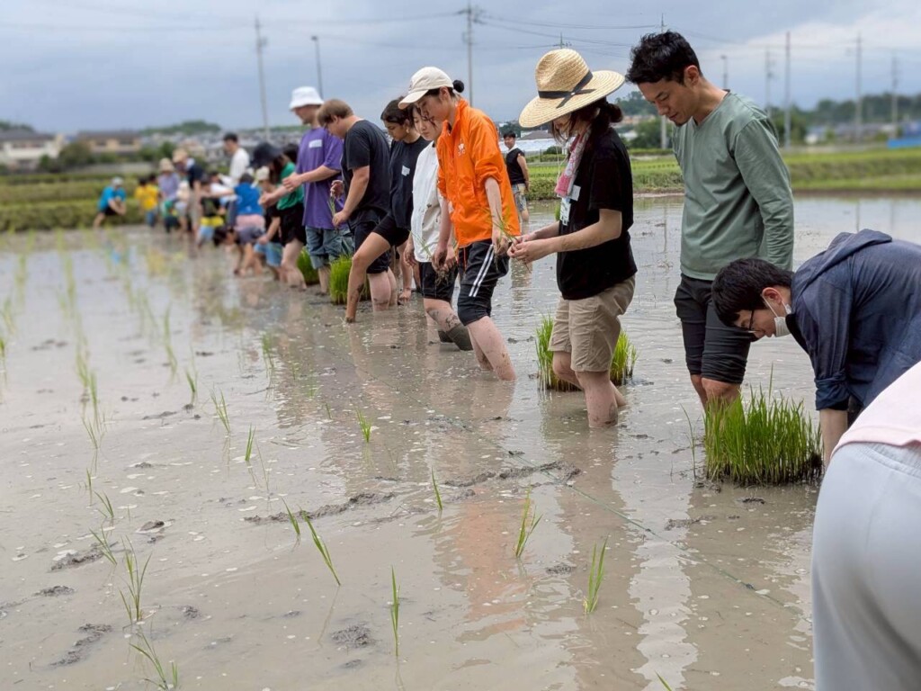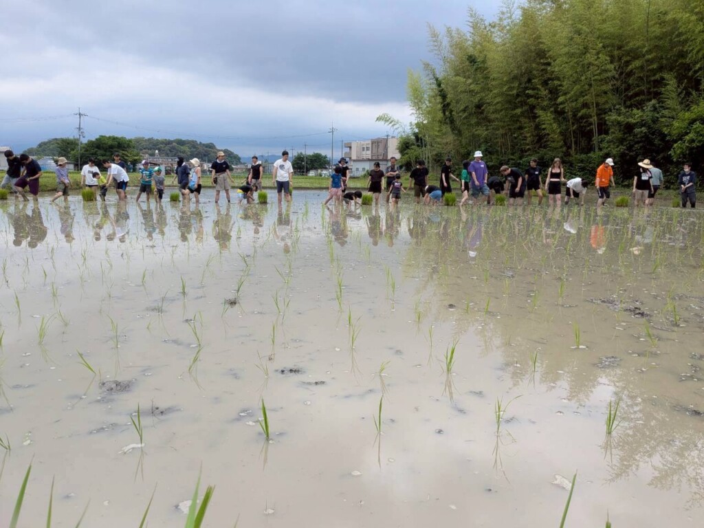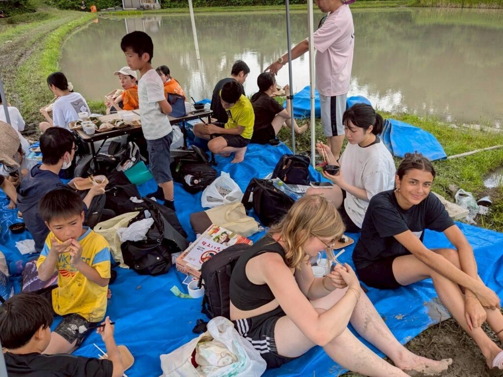 まず泥の田んぼにビックリしてなかなか入れない子ども達という毎年恒例の光景に、今年は海外からの留学生も合流。