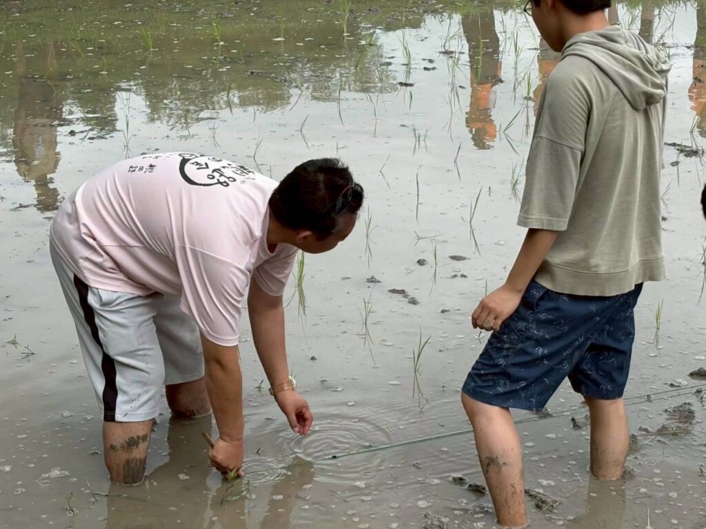 昨年活躍した田植えローリングではなく、今年は一穂プロジェクト手製の田植え紐を活用しての手植え。