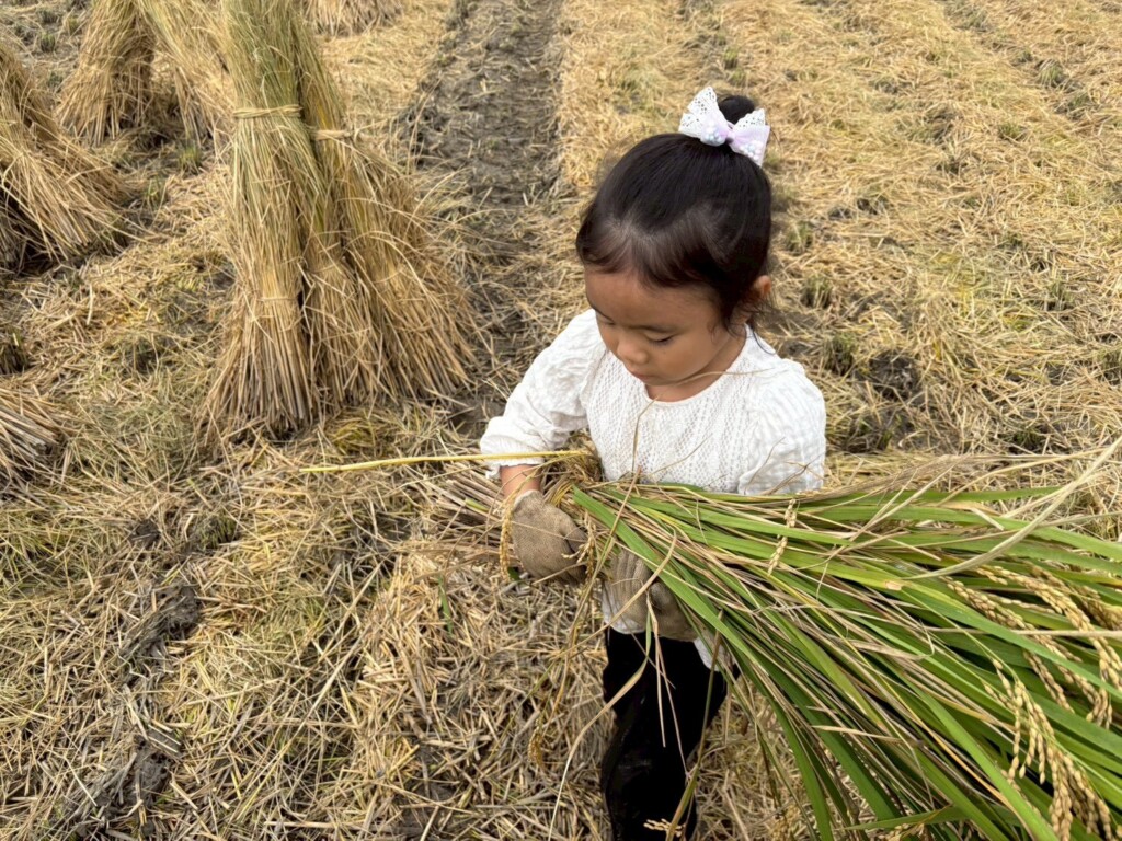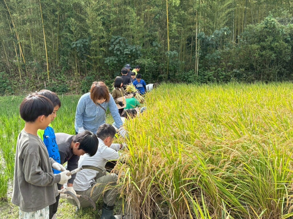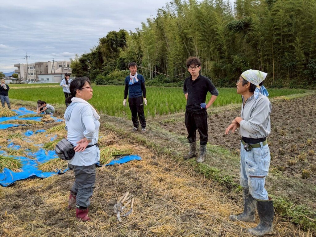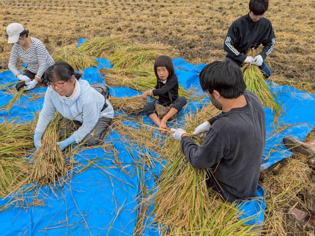 10月19日、雨上がりの曇天の下、一穂プロジェクトの稲刈りをしました。