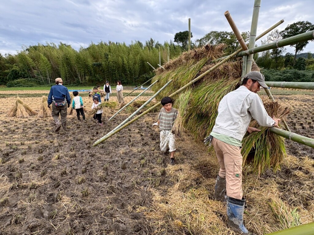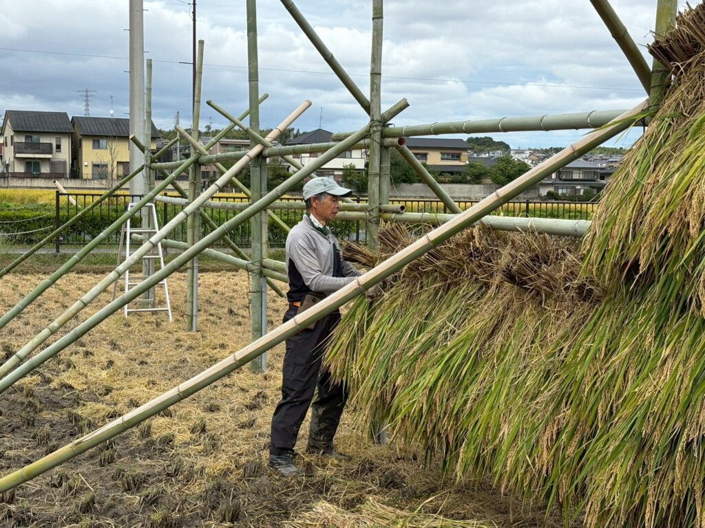 事実、田起こしから代かき、苗作りから日々の水管理、雑草対策、畦草刈り…そして天日干しの為の稲架掛け台準備から最後の脱穀まで、全て石田ファームさんの仕事。